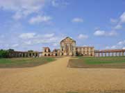 Начнем рассказ об этом удивительном и грандиозном сооружении с дороги - в выходные здесь полно "паломников". Еще на фотографиях 70-х годов 20-го столетия этого леса, скрывающего фасад дворца не было. Да и архитекторы вряд ли его планировали - скорее всего здесь предполагался французский регулярный парк. Но лес вырос и скрыл фасад этого замка... Может быть его не убирали, чтоб скрыть разрисованные вандалами стены, коих было превеликое множество...