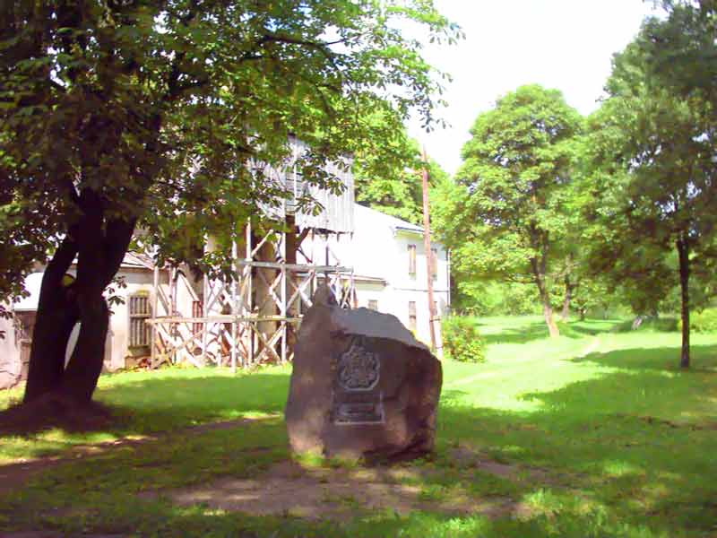 Этот камень с надписью - одно из немногих свидельств того, что мы вступили на "заповедную землю". На заднем плане - робкие попытки реставрации усадьбы Огинского...