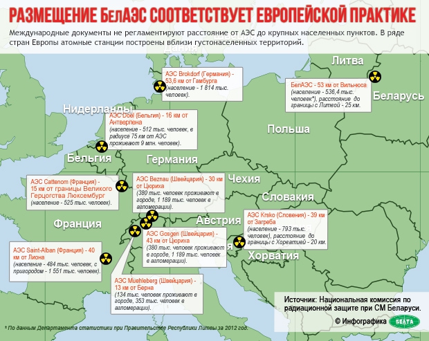 БелАЭС - 53 км от Вильнюса (население - 536,4 тыс. человек*), расстояние до границы с Литвой - 25 км.