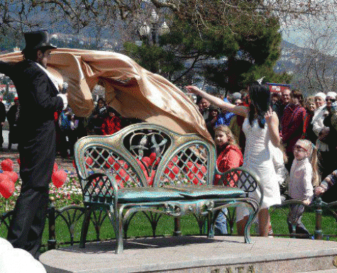 Напомним, новую достопримечательность планировали установить и открыть в Ялте к «историческому» дню рождения города, который отмечается 4 апреля. Однако из-за неблагоприятных погодных условий данное мероприятие пришлось отсрочить. Сегодня данному событию погода способствовала, поэтому на набережной установили сцену, устроив для жителей и гостей города представление о дне рождении Ялты. В конце представления зрителям показали пример того, как следует использовать в дальнейшем «Скамью Любви», усадив на нее жениха и невесту, которые под слова «Горько» влюблено зацеловывали друг друга.