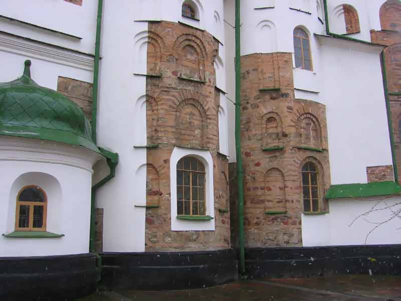 Софийский собор - выписи из БСЭ     в Киеве, собор св. Софии (заложен в 1037), выдающийся памятник древнерусской архитектуры, главное культовое и общественное здание Киевской Руси; главный храм киевских митрополитов. С. с., выстроенный преимущественно из плинфы, большой (37 Х 55 м) пятинефный с 5 апсидами 13-главый крестово-купольный храм, со ступенчатым построением основных сводов. Окружен с 3 сторон двухъярусными галереями. В галереи с З. встроены 2 башни, лестницы которых ведут на просторные хоры. Свой нынешний облик в формах украинского барокко собор приобрёл после перестройки в конце 17 в. - 1707. В интерьере сохранились мозаика и фрески 11 в. В советское время С. с. реставрирован. В 1934 создан архитектурно-исторический музей-заповедник "Софийский музей", включающий, кроме самого С. с., окружающий его ансамбль построек 17-18 вв. См. также Киевская Русь. Лит.: Лазарев В. Н., Мозаика Софии Киевской, М., 1960; София Киевская. Материалы и исследования, К., 1973.