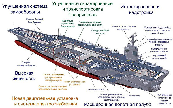 Авианосец "Джеральд Форд" - Одним из существенных технологических новшеств является замена паровых катапульт C-13 на новые электромагнитные катапульты EMALS фирмы "Дженерал Атомикс" (General Atomics) на основе линейных электродвигателей. Демонстрационный вариант катапульты был опробован в Тестовом центре военно-морских авиационных систем (NASC) в Лейкхёрсте (Lakehurst, шт. Нью-Джерси). В случае успеха, электромагнитные катапульты обеспечат большую управляемость процесса запуска самолётов, меньшие нагрузки на самолёты и пилотов, возможность взлёта при более широком диапазоне скоростей и направлений ветра, специальные режимы запуска для беспилотных аппаратов. >>>>
